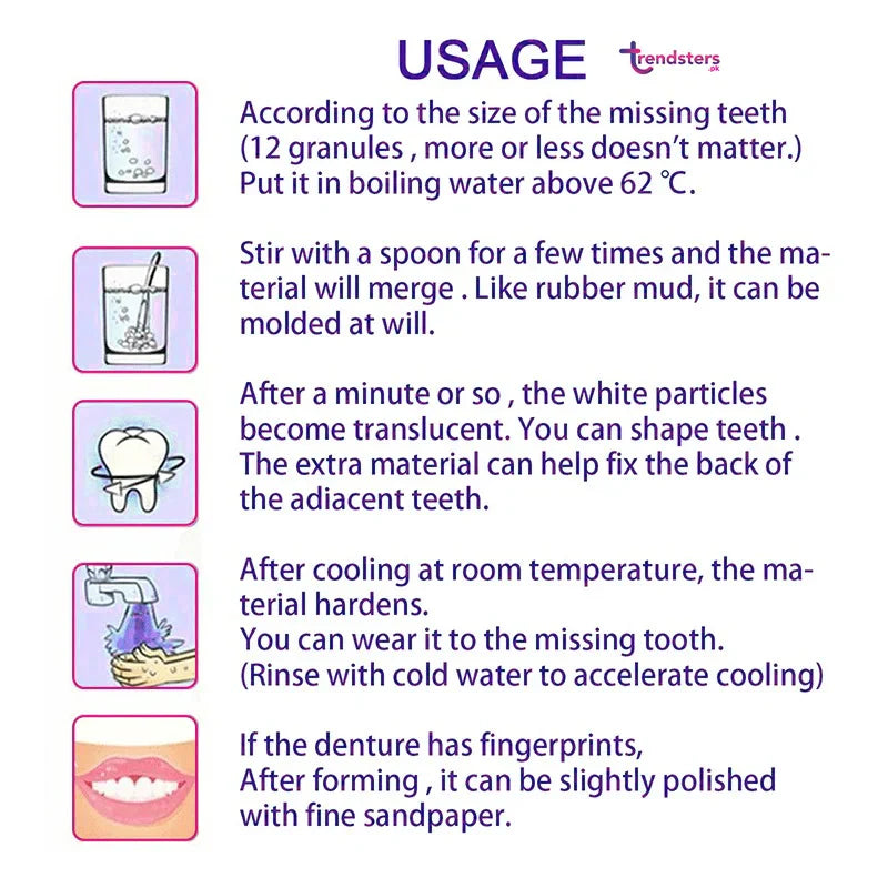 Our missing teeth replacement kit helps to hide your missing teeth and broken tooth. Whether it's an important occasion such as a date, a job interview, or a party, the teeth filling kit can help you regain your confidence & increase your attractiveness.